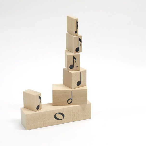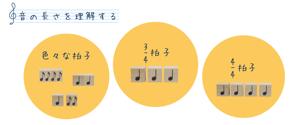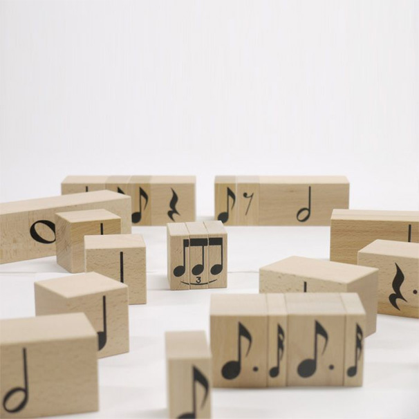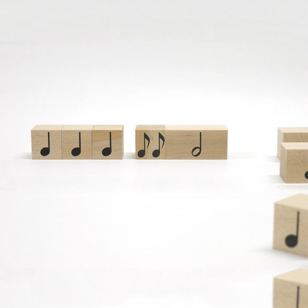 そこで、リズムの長さに従って大きさを決めてある積木を使用し、実際に目で見て手で触れることにより、音符の長さを理解できるようにしたのがこのリズム積木です。4分音符が基準の立方体となり、2分音符の幅は倍、全音符の幅は4倍になり、逆に8分音符は4分音符の半分、16分音符は4分の1の大きさです。