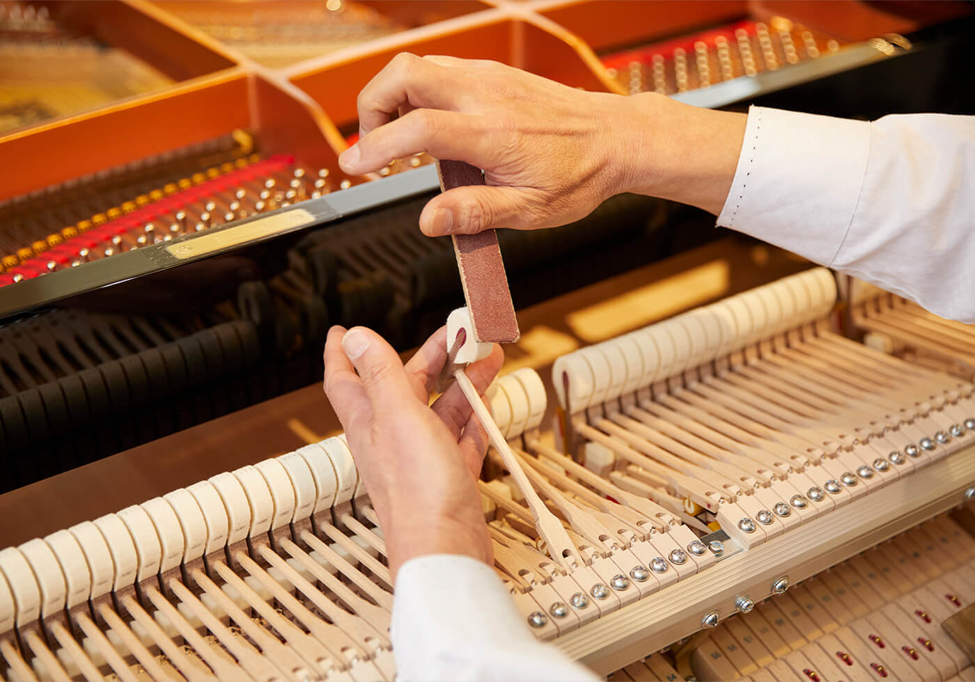 ピアノ技術部に所属する20名以上の調律師が、ピアノの音づくりと維持管理をお手伝いしています。定期調律でお客様のピアノのコンディションを確認し、いつまでもいい音を奏でられるようサポートします。